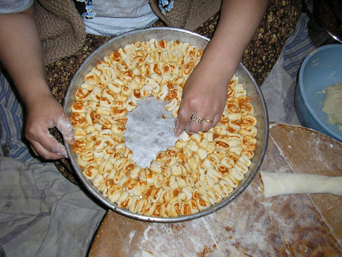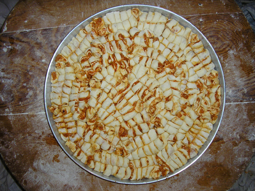 This dish is prepared with 500g of cornflour and 1 kilo of wheat flour. Mix the flour and some salt with ayran (buttermilk) until it is the texture of small beads. Leave to dry on an oiled tray. Mix with 2 tablespoons of butter, 2 cups hot water, 1 cup of ayran (buttermilk). Bake in a traditional oven on a round metal baking-tray or in a modern oven pre-heated to 250°C for 40 minutes.